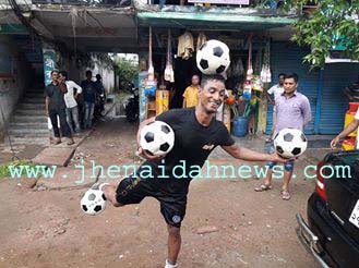 মোটর সাইকেলে চড়ে খালি হাতে ফুটবল মাথায় নিয়ে কখনও শুয়ে, কখনও দাড়িয়ে সারা শহর ঘুরে সবাইকে তাক লাগিয়ে দিল ফুটবল মানব মাসুদ রানা। খুলনার ডুমুুরিয়ার এই বলমানব বৃহস্পতিবার দুপুরে বৃষ্টির মধ্যে নিজের মোটর সাইকেলে বল মাথায় নিয়ে ঝিনাইদহ শহরে আসেন। এরপর থেকে শুরু করেন তার নৈপুণ্য প্রদর্শনী। রাস্তার দু’ধারের শত শত উৎসুক জনতা তার নৈপুণ্য প্রদর্শন উপভোগ করেন।