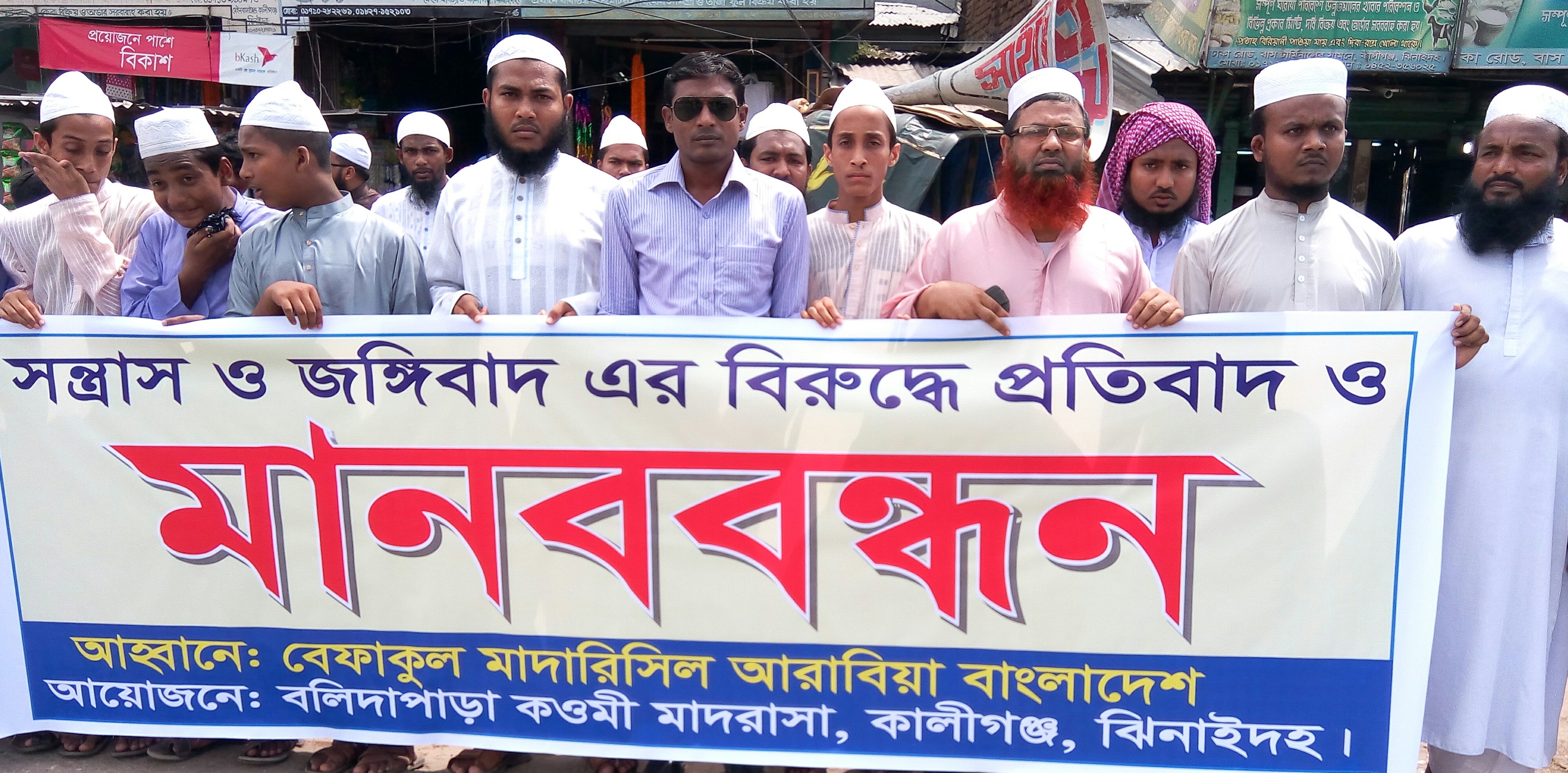 বাংলাদেশ কওমী মাদরাসা শিক্ষা বোর্ড (বেফাক) এর আহ্বানে সারাদেশ জঙ্গিবাদ বিরোধী মানববন্ধনের অংশ হিসাবে ঝিনাইদহে কওমী মাদরাসার শিক্ষক-শিক্ষর্থীরা মানববন্ধন করেছে। কালীগঞ্জ মেইন বাসস্টান্ডে বেলা সাড়ে ১১টার দিকে এ কর্মসূচি পালিত হয়।
