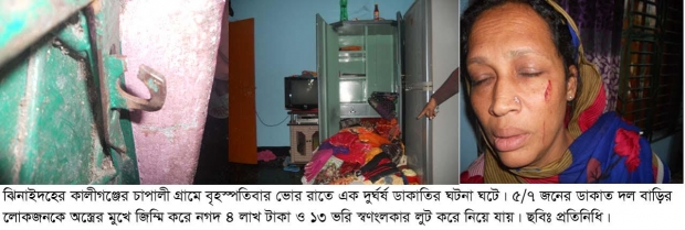 ঝিনাইদহ কালীগঞ্জের চাপালী গ্রামে ৩ দিনের ব্যবধানে ২ টি বাড়িতে ডাকাতির ঘটনা ঘটেছে। ডাকাতরা বাড়ির লোকজনকে অস্ত্রের মুখে জিম্মি করে বেঁধে ফেলে এই দুইটি বাড়ি থেকে নগদ ৬ লাখ টাকা ও ১৮ ভরি স্বর্ণলংকার, ২ টি দামি মোবাইল ফোনসহ প্রায় ১৪ লাখ টাকার মালামাল লুট করে নিয়ে যায়। গত ২৭ নভেম্বর ও ১ ডিসেম্বর ভোর রাতে পৃথক এ ডাকাতির ঘটনা ঘটে।