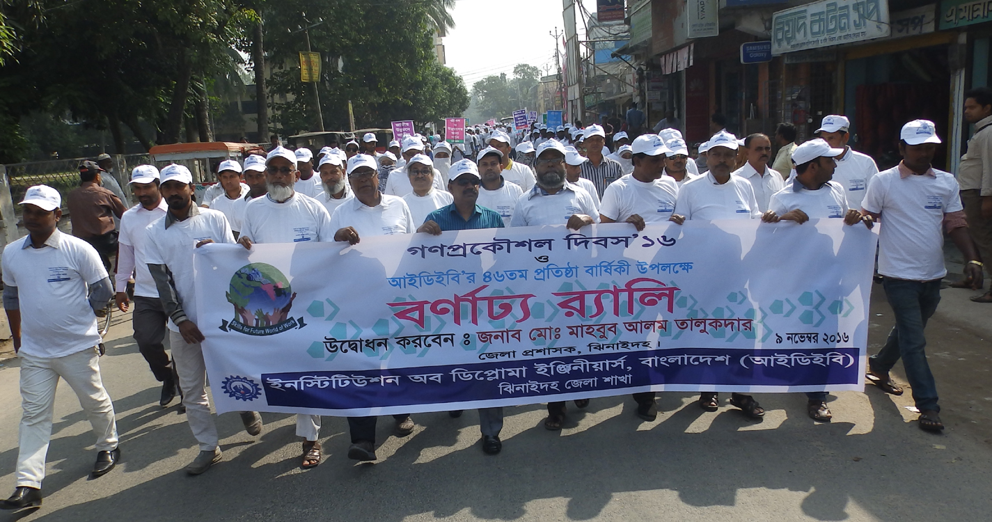 গণপ্রকৌশল দিবস ও ইনস্টিটিউশন অব ডিপ্লোমা ইঞ্জিনিয়ার্স বাংলাদেশ (আইডিইবি) এর প্রতিষ্ঠাবার্ষিকী উপলক্ষে ঝিনাইদহে বর্ণাঢ্য র‌্যালী ও সমাবেশ অনুষ্ঠিত হয়েছে।