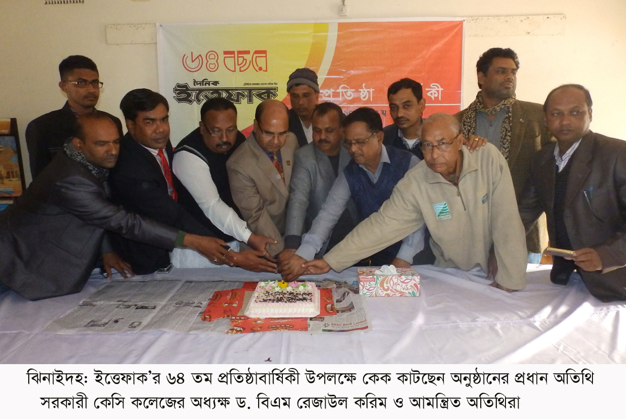 ঝিনাইদহে বর্ণাঢ্য আয়োজনের মধ্যে দিয়ে দৈনিক ইত্তেফাক’র ৬৪তম প্রতিষ্ঠাবার্ষিকী পালিত হয়েছে।শনিবার সকালে এ উপলক্ষে প্রেসক্লাব থেকে একটি র্যালী বের করা হয়।র্যালীটি শহরের প্রধান প্রধান সড়ক প্রদক্ষিণ করে একই স্থানে এসে শেষ হয়।র্যালী শেষে প্রেসক্লাব মিলনায়তনে কেক কেটে প্রতিষ্ঠাবার্ষিকীর উদ্বোধন করেন প্রধান অতিথি সরকারী কেসি কলেজের অধ্যক্ষ প্রফেসর ড. বিএম রেজাউল করিম।পরে প্রেসক্লাবের নব-নির্বাচিত সভাপতি এম রায়হান এর সভাপতিত্বে আলোচনা সভা অনুষ্ঠিত হয়।