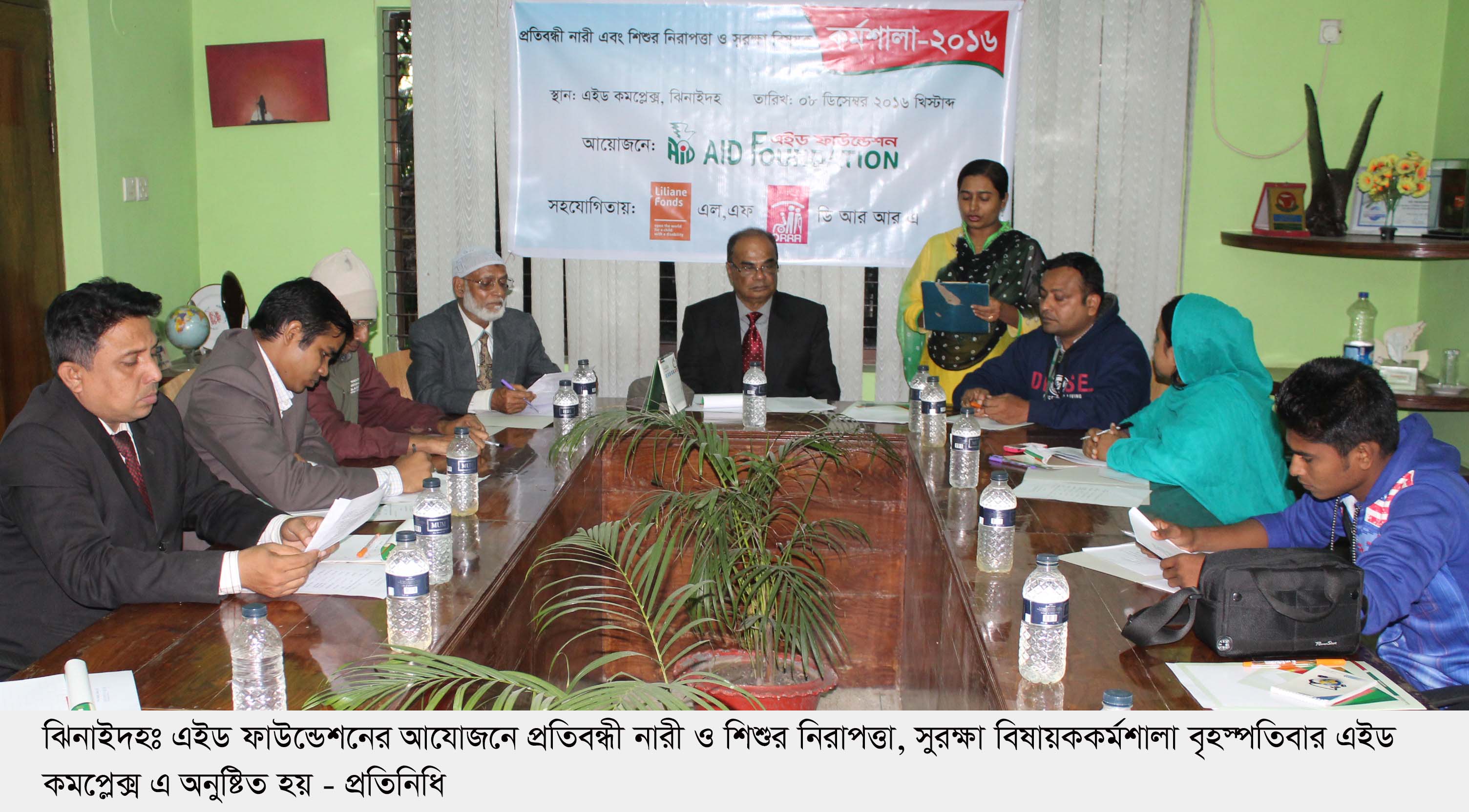 ঝিনাইদহে প্রতিব›দ্ধী নারী ও শিশুর নিরাপত্তা সুরক্ষা বিষয়ক এক কর্মশালা অনুষ্ঠিত হয়েছে। এইড ফাউন্ডেশনের আয়োজনে কর্মশালায় আইনজীবী, প্রতিব›দ্ধী ব্যক্তি, সাংবাদিক ও সুশীল সমাজের প্রতিনিধিরা অংশ নেন।