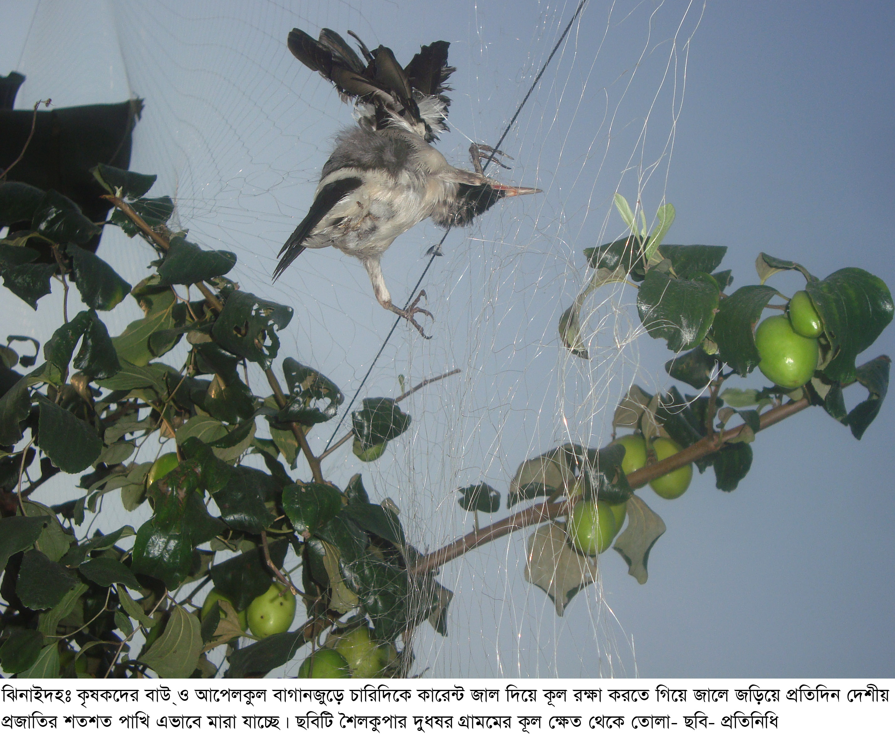 চারিদিকে কারেন্ট জাল ব্যবহার করায় প্রতিদিন অবাধে মারা পড়ছে দেশীয় প্রজাতির নানা পাখি। উচ্চ ফলনশীল, সুস্বাদু রসালো ফল বাউকুল রক্ষায় বাগানে কৃষকেরা ব্যবহার করছে কারেন্ট জাল ।