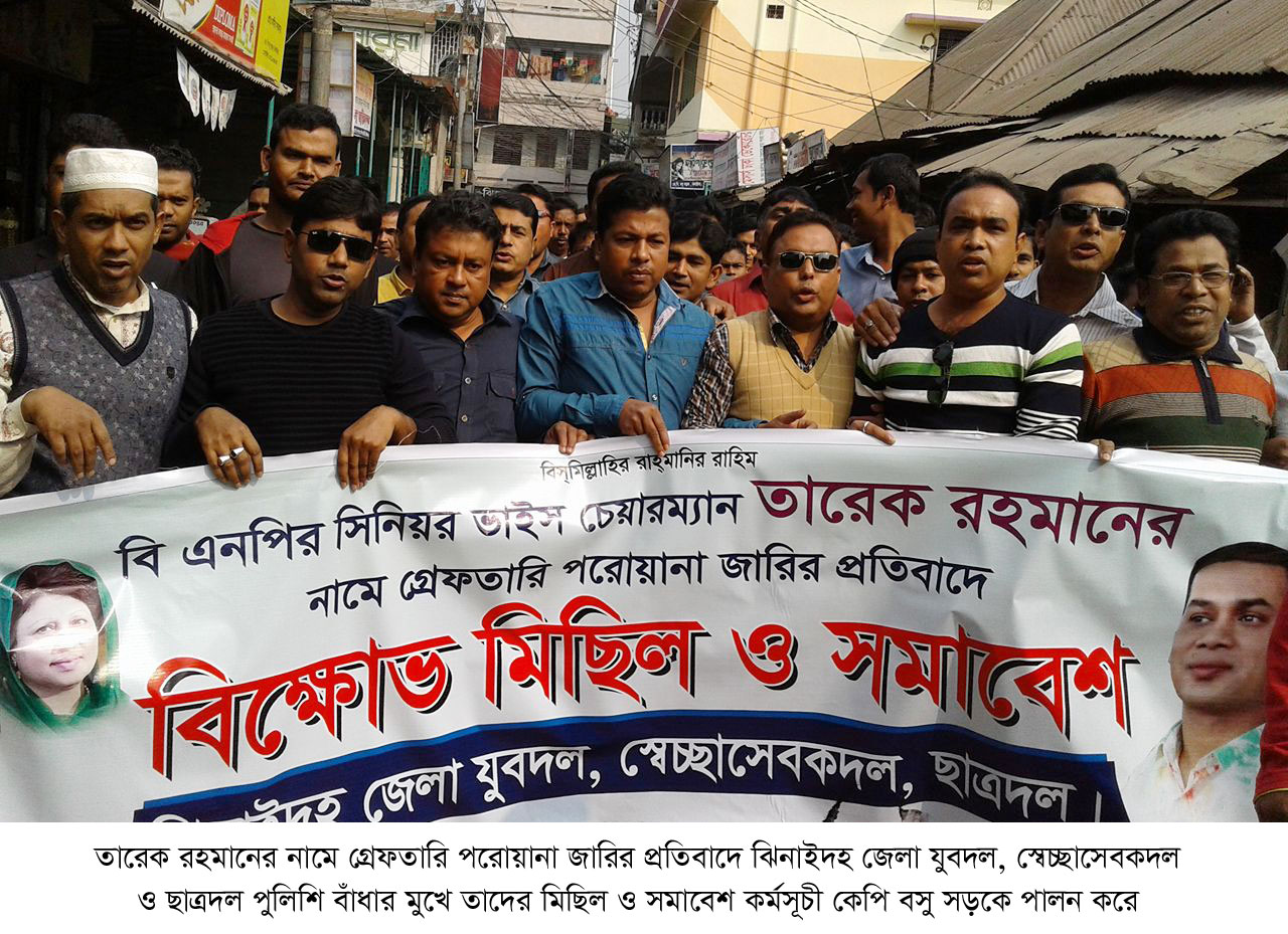 তারেক রহমানের নামে গ্রেফতারি পরোয়ানার প্রতিবাদে ঝিনাইদহে মিছিল ও সমাবেশ”