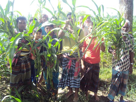 এ অবস্থা প্রতিটি ক্ষেতের অধিকাংশ গাছে দেখা দিয়েছে। ওই মাঠের চাষী আব্দুল কাদের বলেন- আমি তিন বিঘা জামিতে “পেট্টোকেম” কোম্পানীর পায়োনিয়ার ৩৩ ভি ৯৬ জাতের ভুট্টার বীজ রোপন করেছি। জমিতে চারা গজালেও ভুট্টা গাছে মোচা আসার আগেই জমির অধিকাংশ গাছ কুকড়ে ও মাথা মোটা হয়ে গেছে। এ অবস্থায় আমরা ভুট্টা ক্ষেত নিয়ে বিপাদের মধ্যে আছি। ভুট্টা চাষী রুহুল আমিন তিনি দেড় বিঘা ও আব্দুল আড়াই বিঘা ভুট্টা চাষ করেছেন। এ চাষী দু’জন অভিন্ন বক্তব্যে বলেন- আমাদের এ মাঠে প্রায় ৫০জন চাষী “পেট্টোকেম” কোম্পানীর পায়োনিয়ার ৩৩ ভি ৯৬ জাতের ভুট্টার চাষ করেছি আমাদের প্রত্যেককেরি জমিতে ভুট্টার অধিকাংশ গাছ কুকড়ে ও মাথা মোটা হয়ে মারা যাচ্ছে। কিন্তু পাশাপাশি কিছু কিছু চাষী অন্য কোম্পানীর ভুট্টার বীজ বোপন করেছে তাদের ভুট্টা গাছ ক্ষতি গ্রস্থ হয়নি।