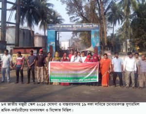 মানববন্ধনে বক্তারা জাতীয় মজুরী স্কেল ২০১৫ ঘোষণা সহ ১৯ দফা দাবি বাস্তবায়নে সরকারের নিকট জোর দাবি জানান।