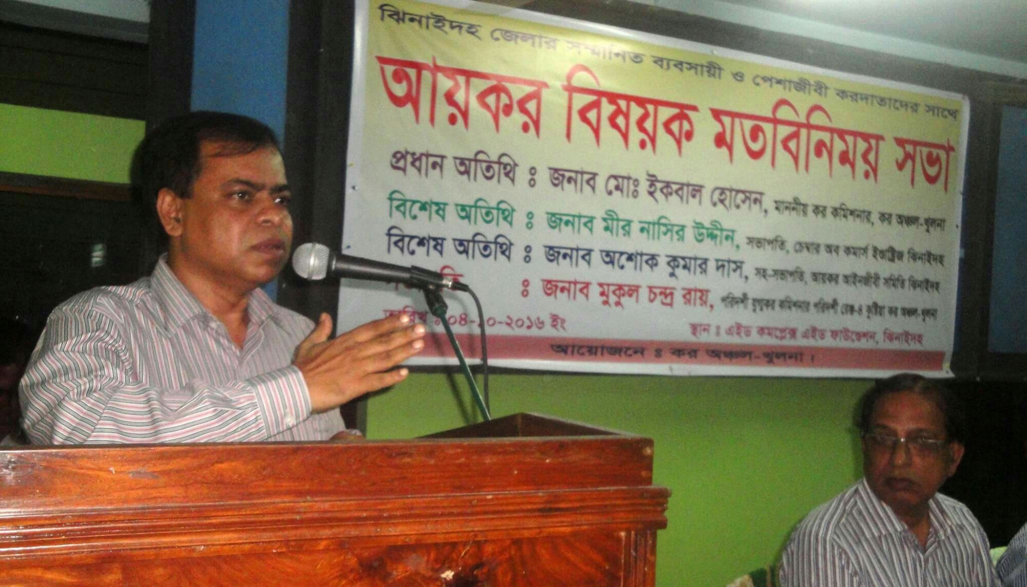 মঙ্গলবার সন্ধ্যায় ঝিনাইদহের একটি কমপ্লেক্স ভবনের মিলনায়তনে এ সভার আয়োজন করে খুলনা কর অফিস। কর অঞ্চল খুলনা’র কুষ্টিয়া রেঞ্জ-৪ এর পরিদর্শী যুগ্ম কর কমিশনার মুকুল চন্দ্র রায় এর সভাপতিত্বে অনুষ্ঠানে প্রধান অতিথি হিসেবে বক্তব্য রাখেন খুলনা কর অঞ্চলের কর কমিশনার ইকবাল হোসেন।